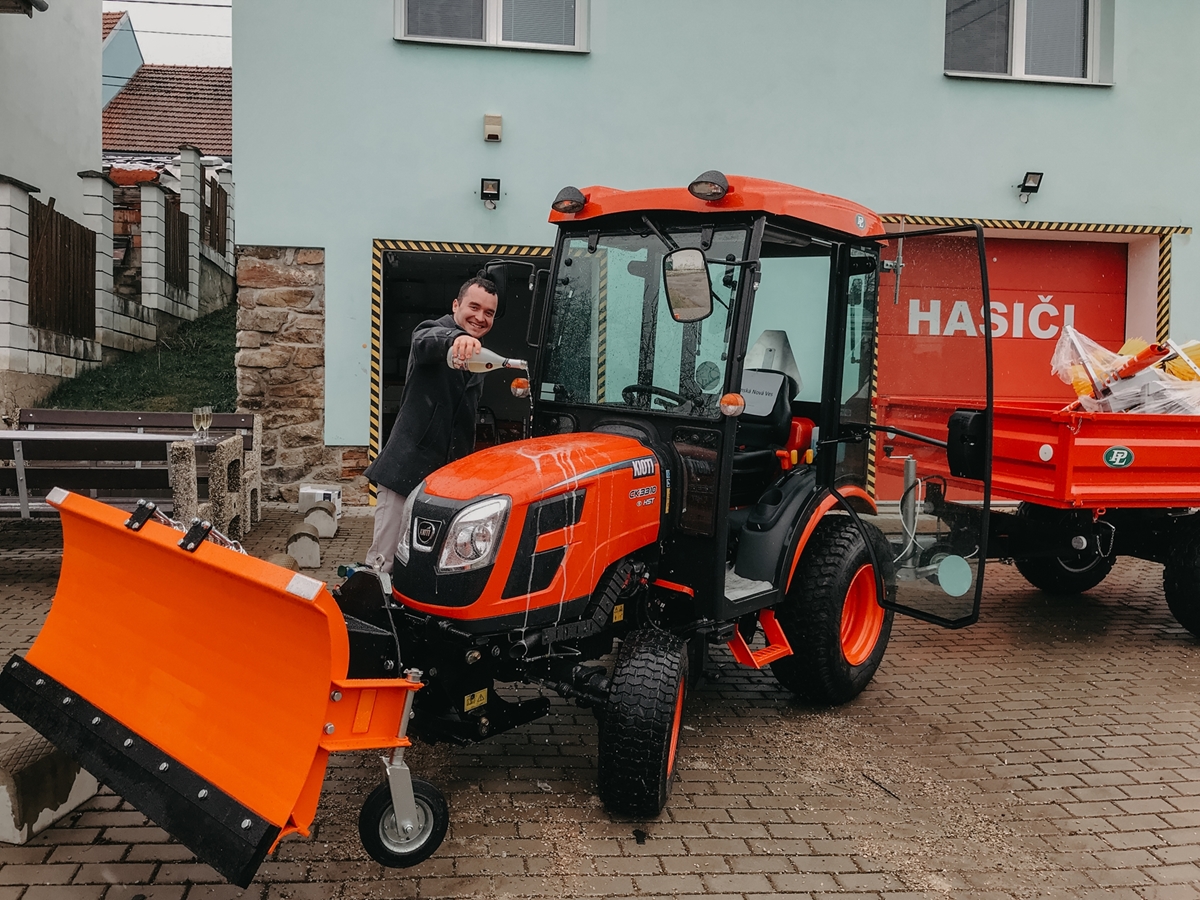 Nový Kioti CK3310H bude sloužit v Kuřimské Nové Vsi! Základem je zimní set - traktor s kabinou, radlicí a rozmetadlem. Dále kartáč na zametání, mezinápravová sekačka! Kioti obslouží celou obec! Team Kioti!