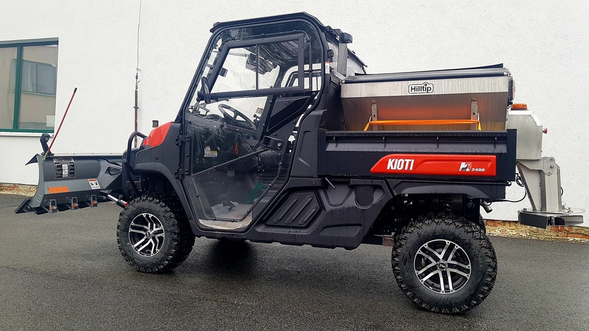 Elektrické nerezové rozmetadlo ovládané z kabiny řidiče na monitoru, Objem 380 litrů. GPS - automatická dávka posypu dle rychlosti pojezdu. Velmi efektivní sypání - značná úspora soli!